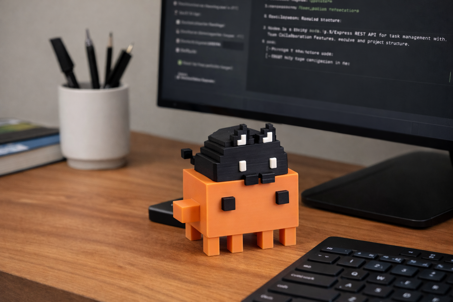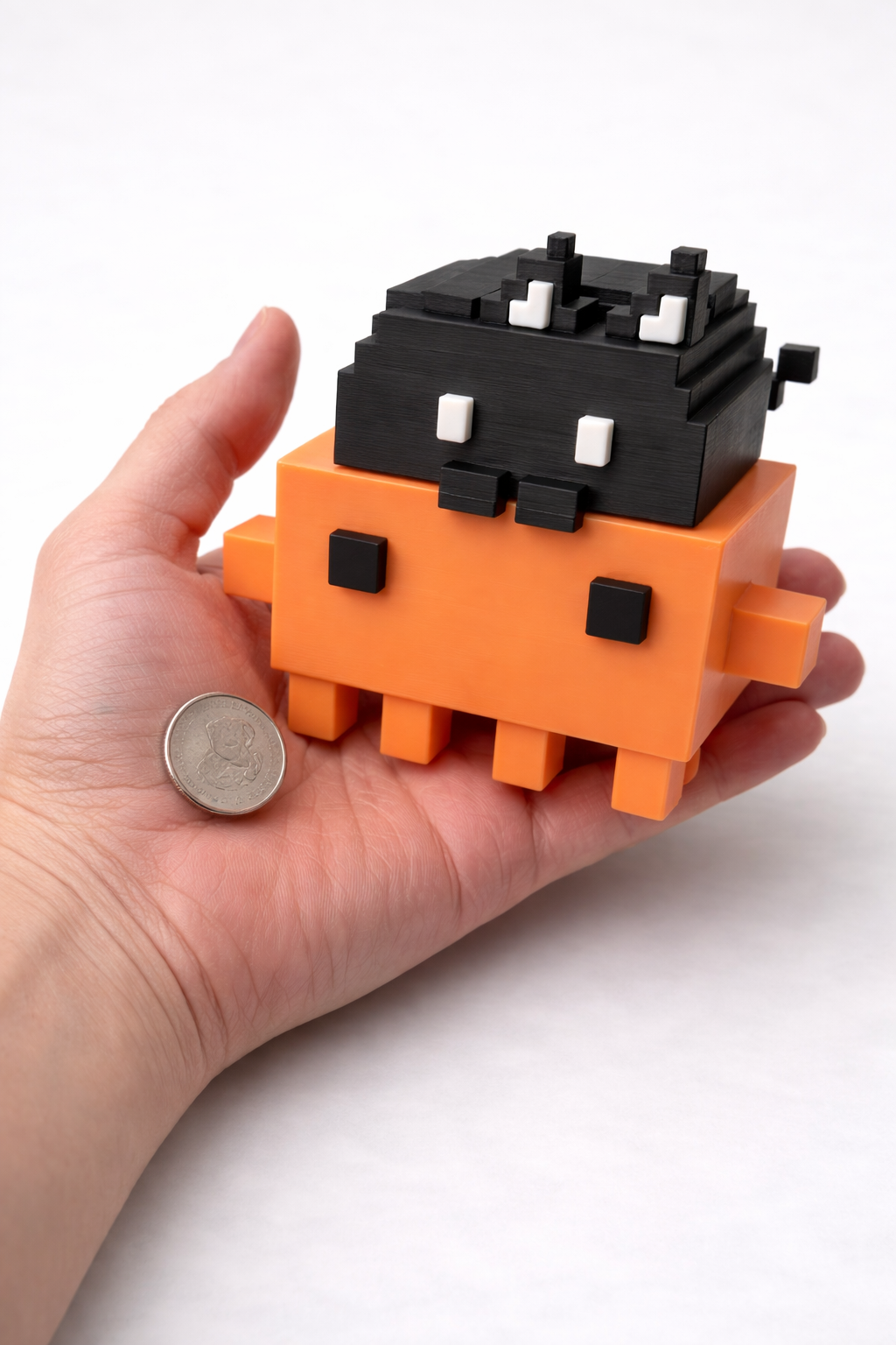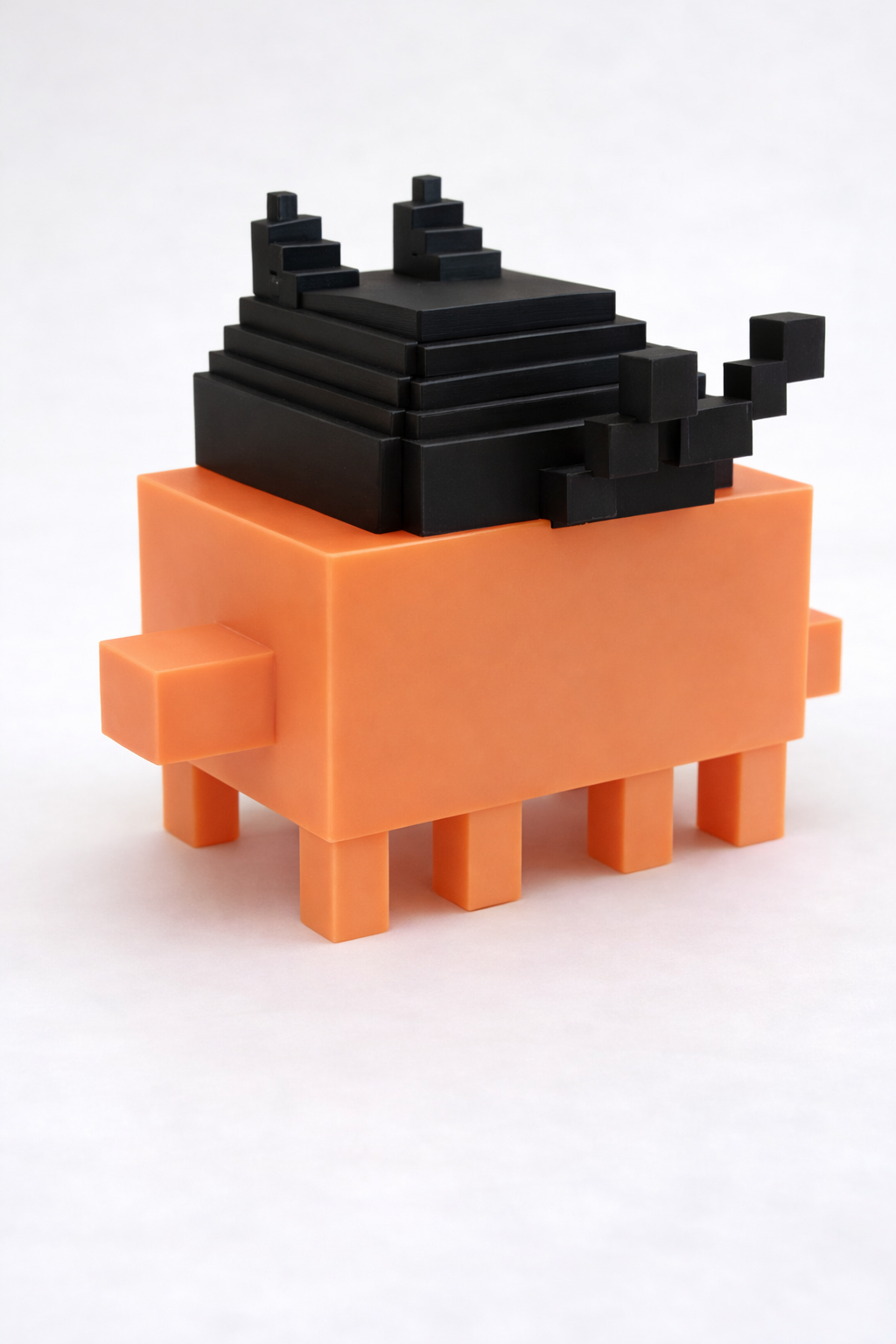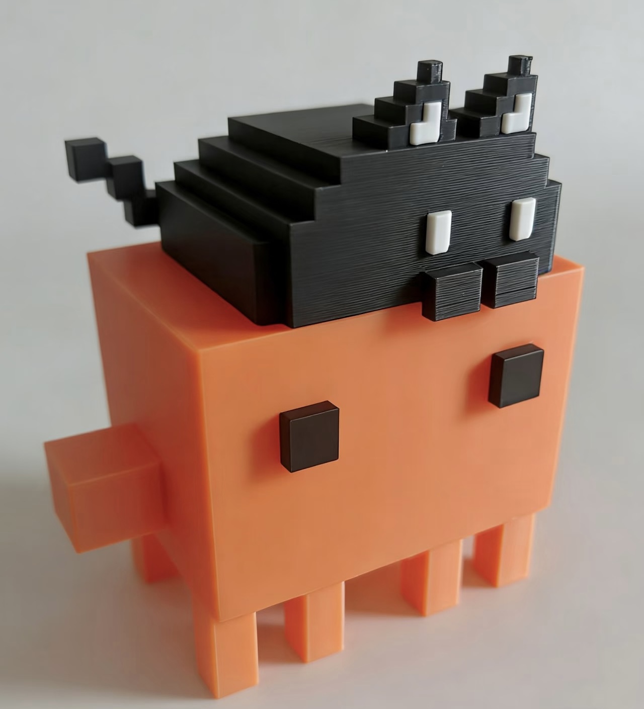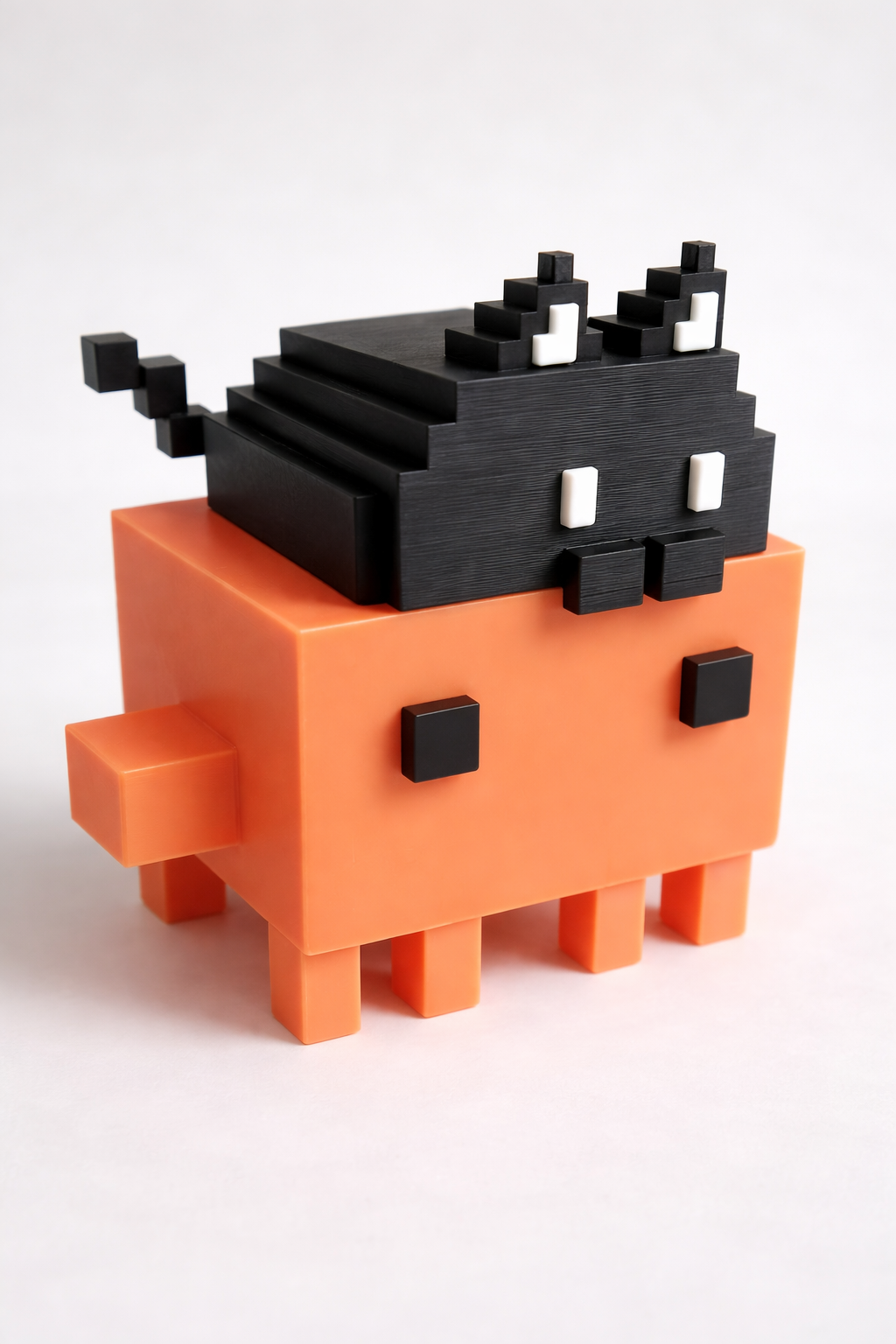 A handcrafted 3D printed voxel figure featuring an adorable orange character topped with a playful black cat companion. Each piece is precision-printed with vibrant, durable PLA materials.